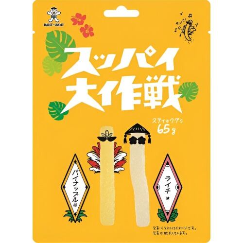 パイナップル味とライチ味のハードな噛み応えのあるスティックグミ